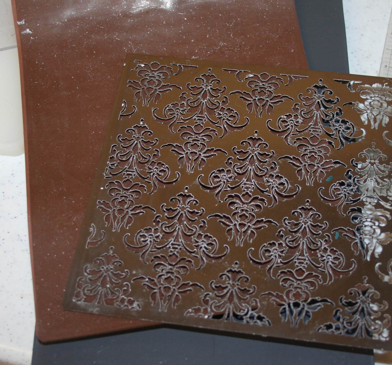 For todays project I wanted to emboss on some copper sheets to show the versatility of these wonderful frames. I started with LX7701 Lg Damask Stencil from Dreamweaver Stencils and large piece of copper metal. (Lynell carries some lovely metal sheets from Merc Art but none of the sheets were quite large enough to do 3 ovals, so I used a pack from my stash.